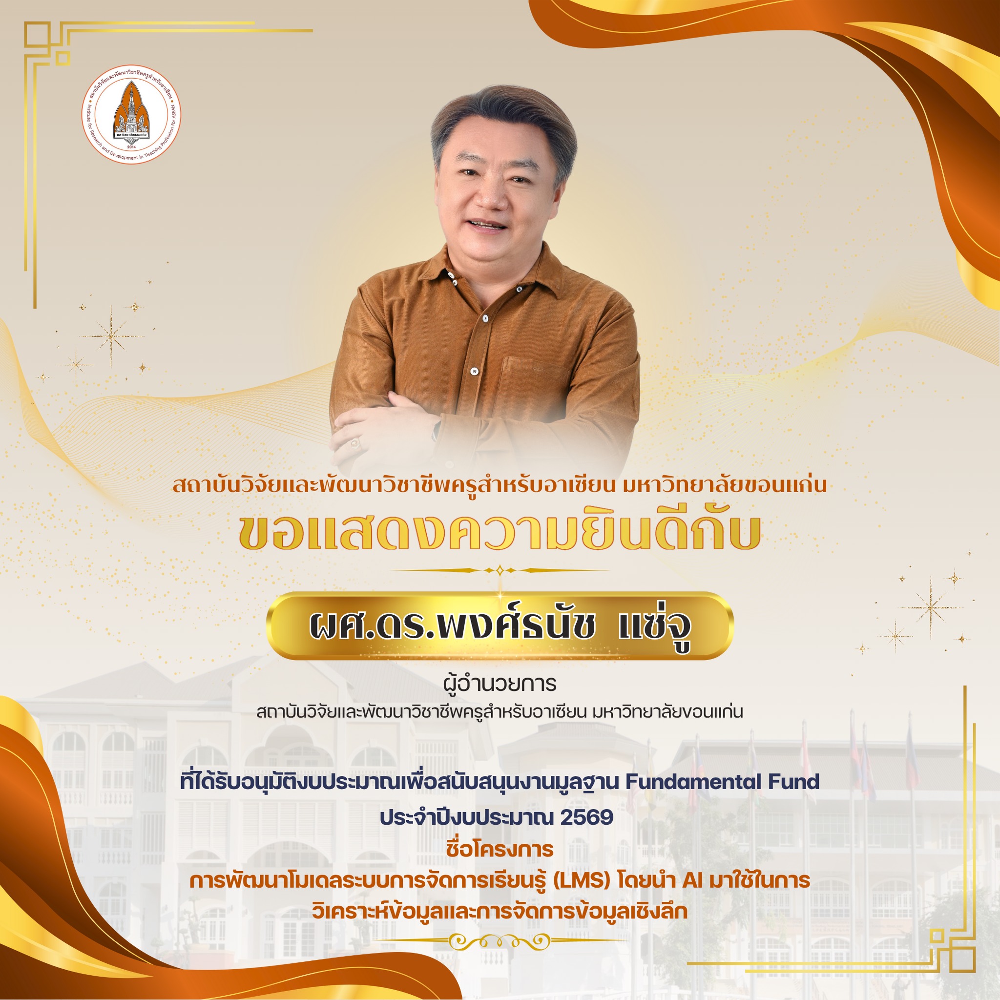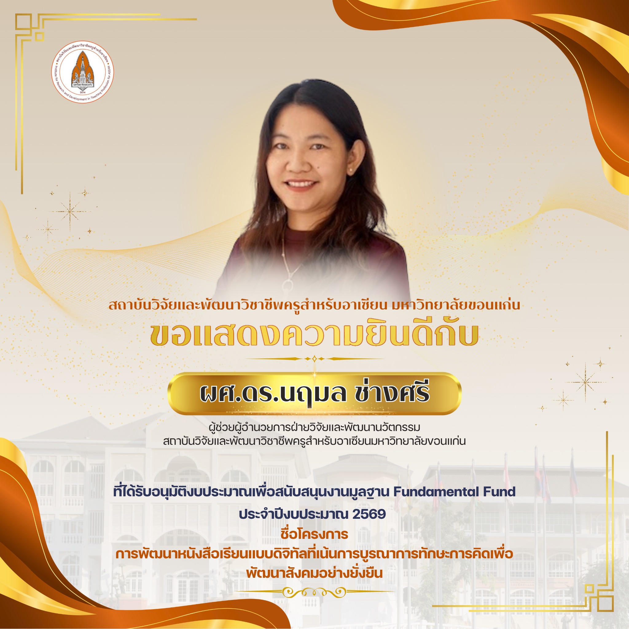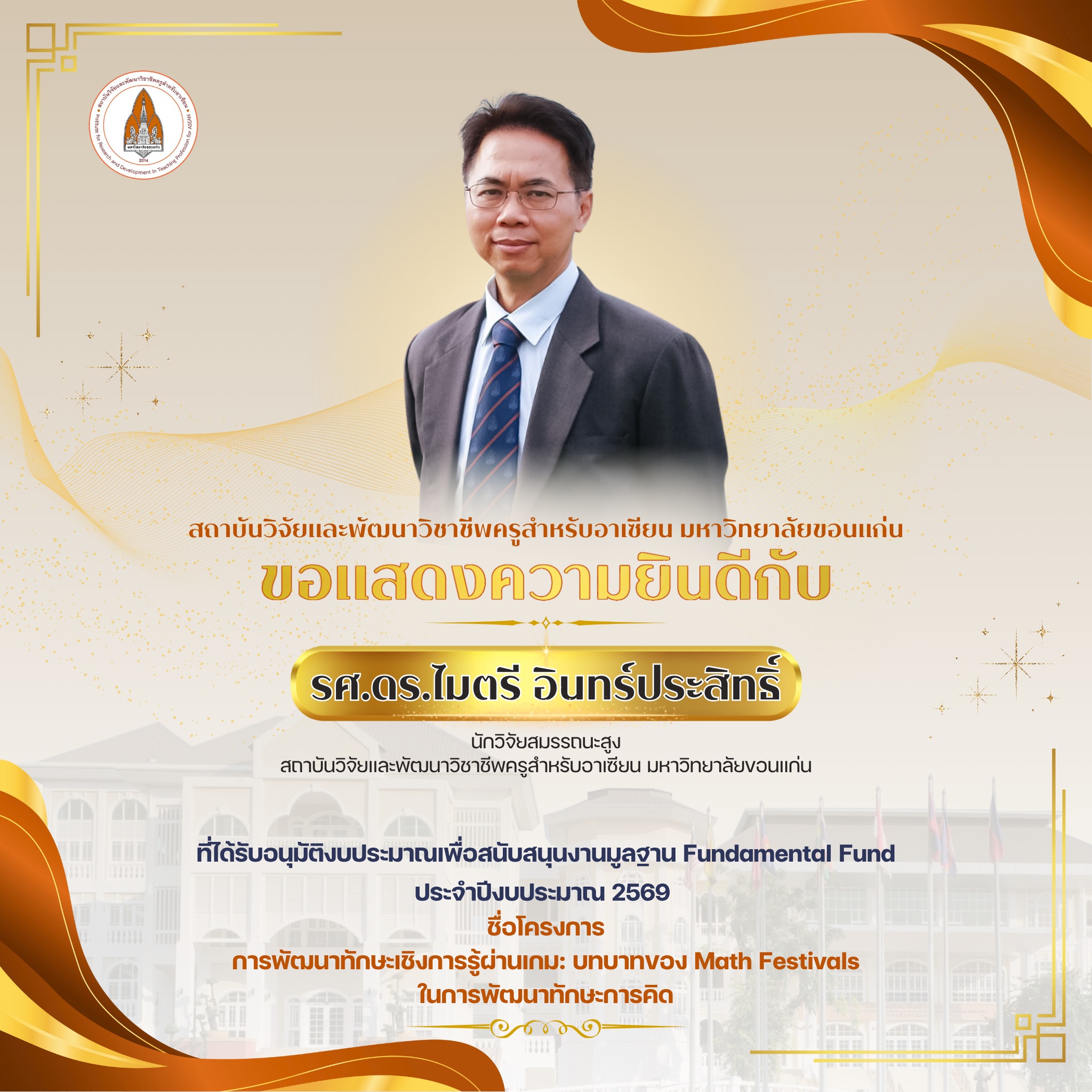สถาบันวิจัยและพัฒนาวิชาชีพครูสำหรับอาเซียน มหาวิทยาลัยขอนแก่น ร่วมแสดงความยินดีกับ ผู้อำนวยการสถาบันวิจัยและพัฒนาวิชาชีพครูสำหรับอาเซียน ผู้บริหาร และบุคลากร ที่ได้รับการอนุมัติงบประมาณสนับสนุนงานวิจัยมูลฐาน (Fundamental Fund) ประจำปีงบประมาณ พ.ศ. 2569 ซึ่งได้รับการสนับสนุนจาก กองทุนส่งเสริมวิทยาศาสตร์ วิจัย และนวัตกรรม (ววน.) ซึ่งสถาบันวิจัยและพัฒนาวิชาชีพครูสำหรับอาเซียน มีพันธกิจหลัก ด้านการทำวิจัยเพื่อพัฒนานวัตกรรมสำหรับปฏิรูปชั้นเรียนในระดับโรงเรียน วิจัยในหัวข้อที่เกี่ยวกับความรู้ของครู วิจัยเพื่อพัฒนาหนังสือเรียนและสื่อการสอนให้สามารถสนับสนุนการจัดกิจกรรมการเรียนรู้ของครูเพื่อพัฒนากระบวนการเรียนรู้ของนักเรียนได้ และสอดคล้องกับ ยุทธศาสตร์ในการขับเคลื่อนพันธกิจด้านการวิจัยและบริการวิชาการ ของมหาวิทยาลัยขอนแก่น เสาหลักที่ 1: ความเป็นเลิศทางวิชาการและนวัตกรรม (Academic Excellence and Innovation) ยุทธศาสตร์ 2 ปรับเปลี่ยนการทำงานวิจัย (Research Transformation) เพื่อสร้างผลงานวิจัยและนวัตกรรมที่มีมูลค่าและผลกระทบสูง