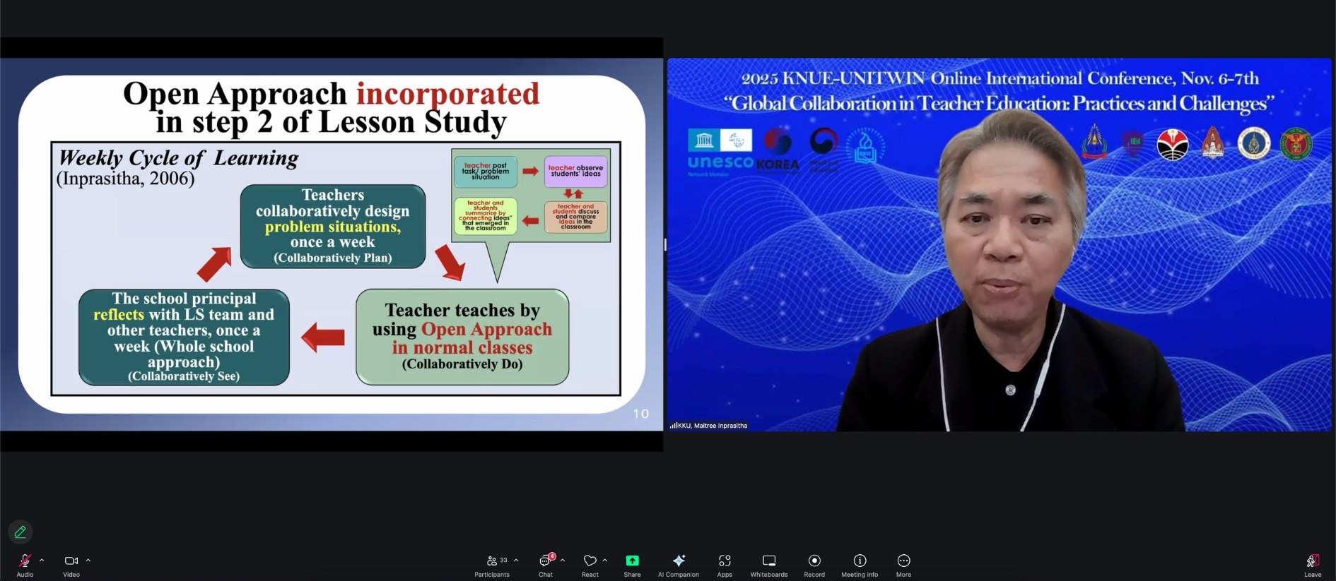 Additionally, high-performance researcher Associate Professor Dr. Maitree Inprasitha delivered a presentation titled "Overview of the National Curriculum or Recent Educational Policies in Thailand," outlining the country's educational policy direction and key issues for the future of teacher development in Thailand.